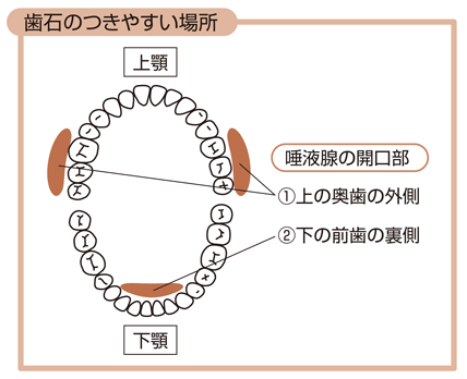 プラークをそのまま放っておくと、唾液に含まれるカルシウムやリン酸などのミネラルが沈着して、石のように固まります。