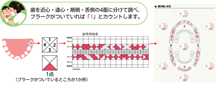 PCR = (プラークが付いていた歯面 ÷ 全ての歯面) × 100